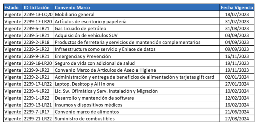 Actualmente, estamos realizando un seguimiento extensivo de los Nuevos Convenios Marcos relacionados con Productos de Ferretería y Servicios (2239-9-LR23) y Adquisición de Vehículos y Maquinarias (2239-8-LR23), que actualmente están en etapa de preguntas. Además, estamos llevando a cabo los pasos necesarios para la etapa de habilitación de los Convenios Marcos de Mobiliario General (2239-3-LR23) y Artículos de Escritorio y Papelería (2239-2-LR23).