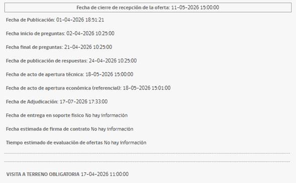 A continuación, se presenta el calendario del proceso licitatorio, para que pueda planificar oportunamente su participación.
