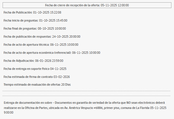 En caso de estar interesados en postular a esta licitación, les recordamos que la fecha de cierre de recepción de ofertas es el 5 de noviembre de 2025.