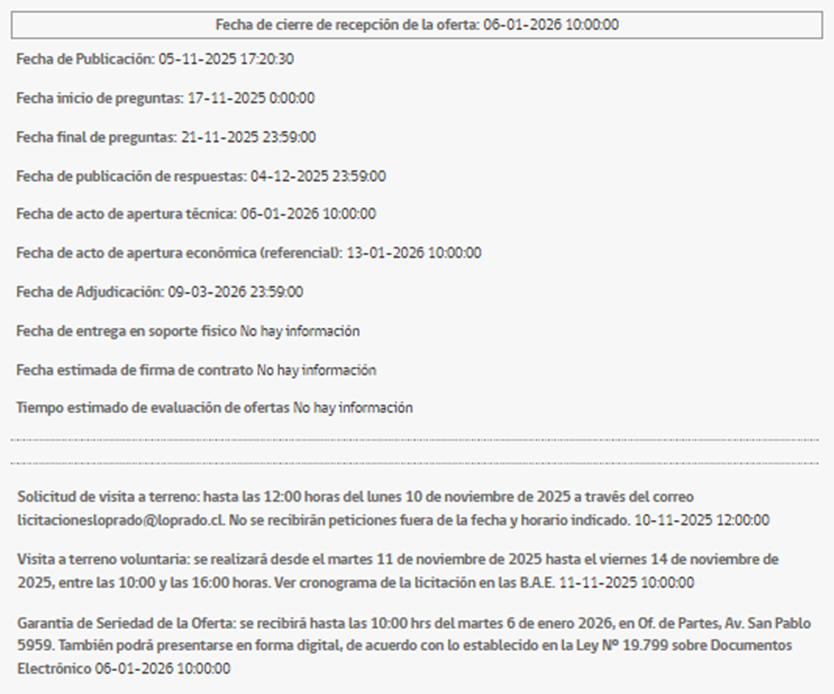 En caso de estar interesados en postular a esta licitación, les recordamos que la fecha de cierre de recepción de ofertas es el 6 de enero de 2026.