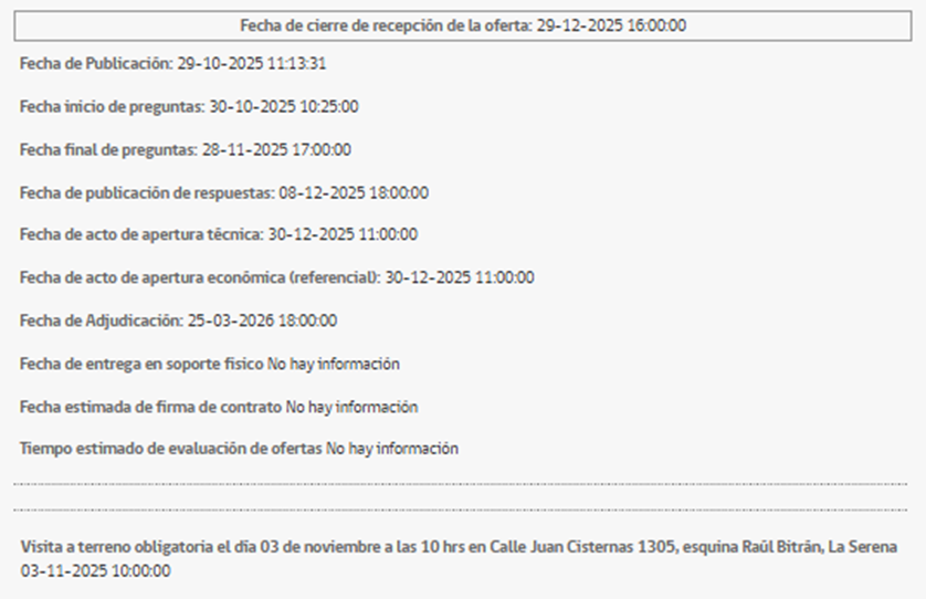 En caso de estar interesados en postular a esta licitación, les recordamos que la fecha de cierre de recepción de ofertas es el 29 de diciembre de 2025.